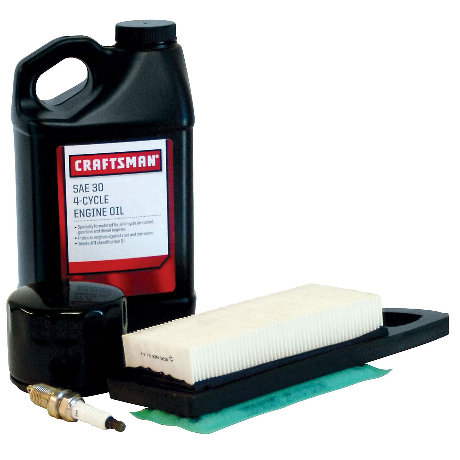 To my good fortune, this week’s bargain-aisle included the Craftsman Briggs & Stratton 14-19 Horsepower Intek Tune-Up Kit.  The 9x10x5 inch box contained the aforementioned air filter, plus an oil filter, spark plug and a 48-fluid-ounce jug of SAE 30, 4-cycle engine oil.