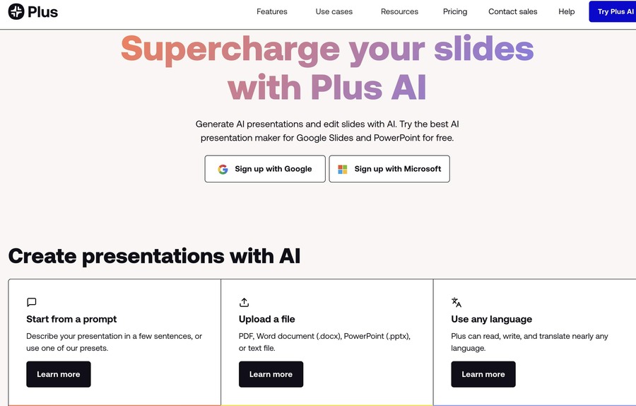 - Plus AI: Offers native integration with PowerPoint/Google Slides and advanced editing features for professionals who demand precision.