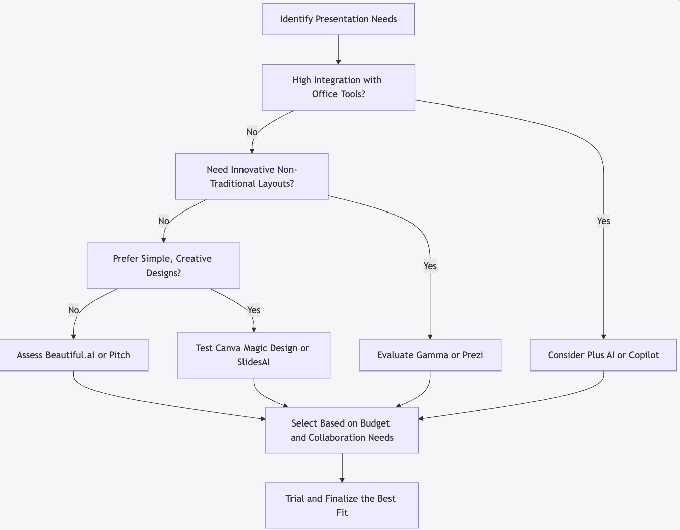 Below is a Mermaid diagram illustrating a simplified decision process when selecting the best AI presentation tool for your professional needs: